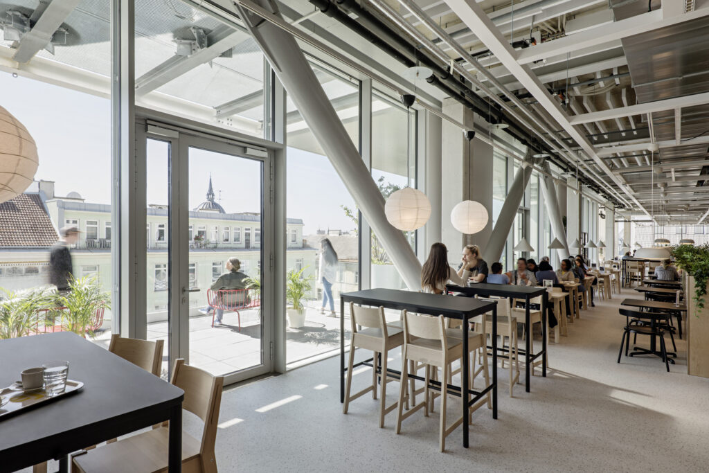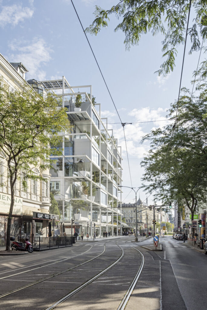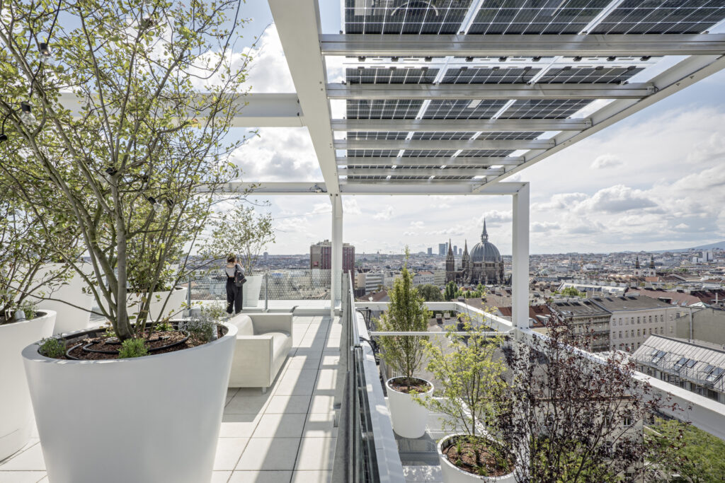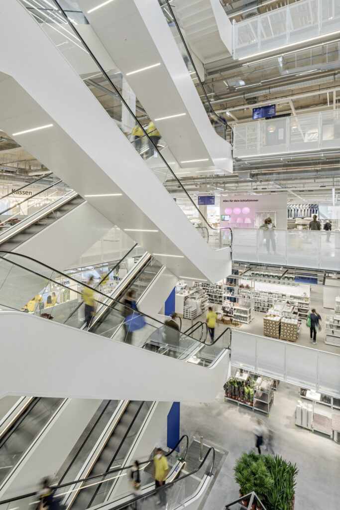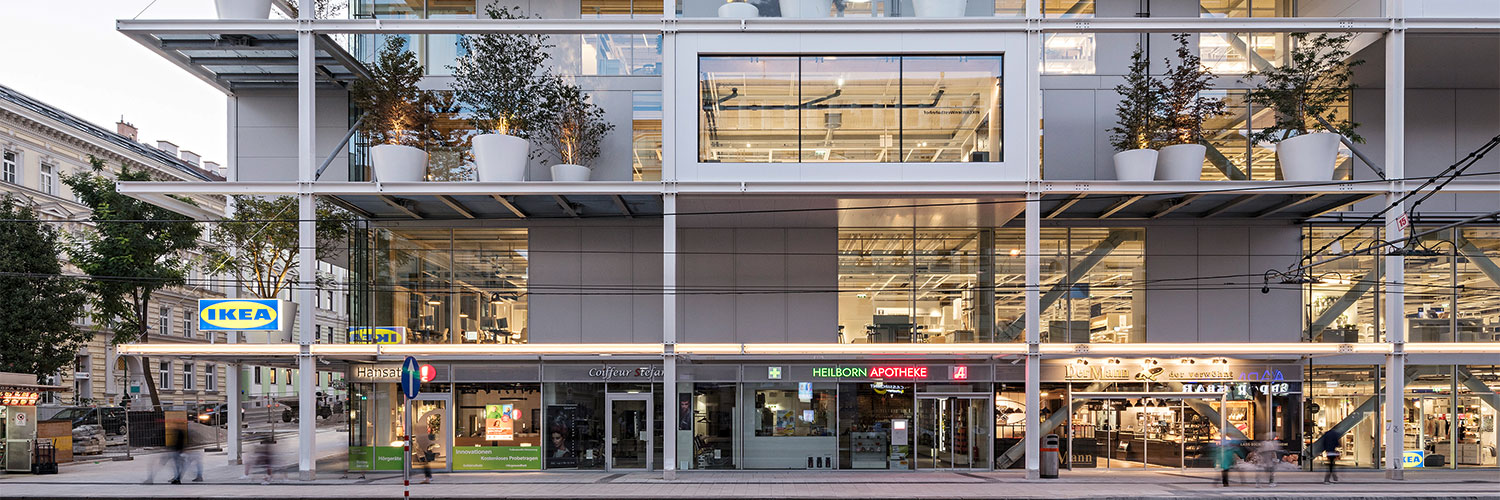 Das Möbelhaus am Wiener Westbahnhof verwandelt das Einkaufen in ein urbanes Erlebnis mit Blick auf Wien. Nachhaltigkeit steckt in der Haustechnik, im Mobilitätskonzept ohne Parkplätze, in der intensiven Begrünung von Dach und Fassade mit Rankpflanzen insgesamt 160 Bäumen.